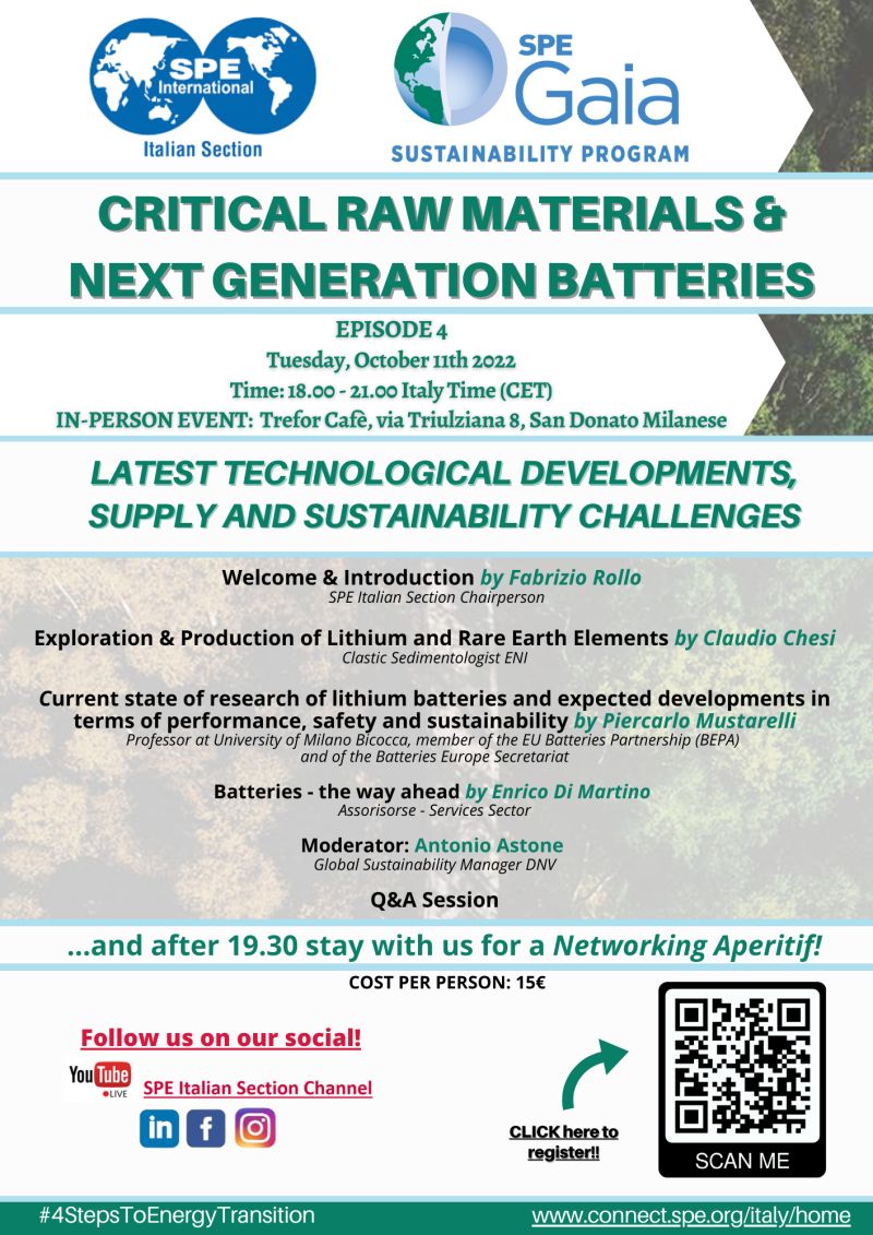 L’11 ottobre 2022 si è tenuto presso il Tre for Cafè di San Donato Milanese l’evento “Critical Raw Materials & Next Generation Batteries” organizzato da SPE – Italian Section al quale ha partecipato, in rappresentanza del Settore Servizi di Assorisorse, Enrico Di Martino che ha illustrato il punto di vista di Assorisorse sulle strade da percorrere per la decarbonizzazione delle batterie.